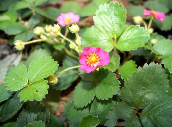 Красивая земляника с насыщенно - розовыми цветами и ярко - зеленой листвой. Земляника с яркими цветами - идеальное сочетание красоты, пользы. Розовые цветы с желтой серединкой радуют глаз своей красотой + вкусная, не крупная ягода.
