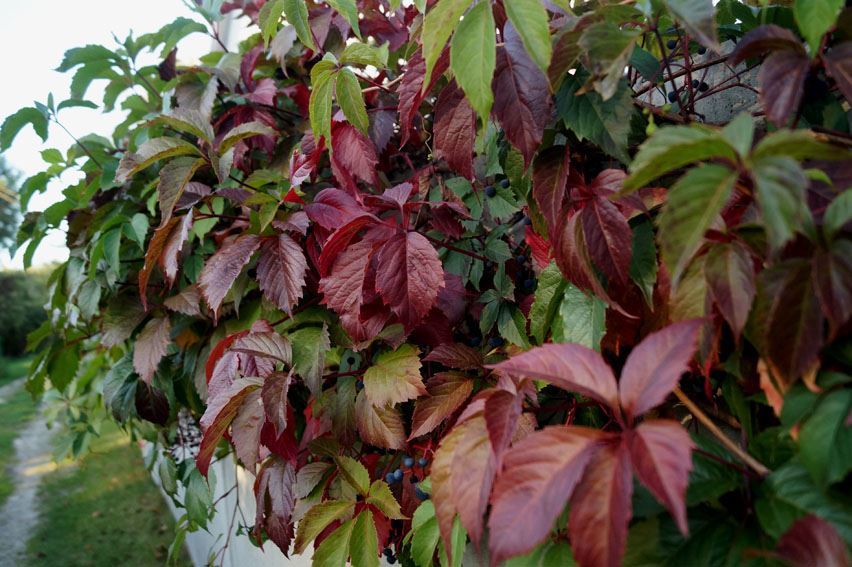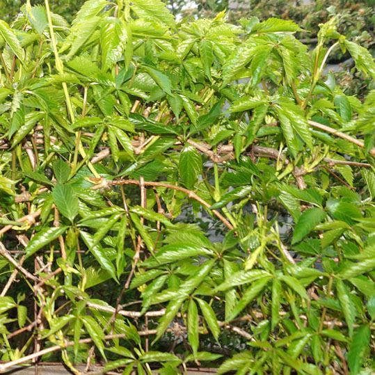 Отличное растение для влажных мест. Крупная вьющаяся лиана до 15-20 м. Молодые побеги красноватые, позднее темно-зеленые. Листья сложные, пальчатые. Листочки черешчатые, до 10 см с заостренной верхушкой, сверху темно-зеленые, снизу светлее, сизоватые. Цветки на тонких цветоножках в 3-6-цветковых зонтиках, собранных в верхушечные соцветия. Плод — синевато-черная ягода с сизым налетом.